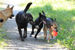 We offer in house cage free boarding services for well socialized canine family members. We have approximately 5 acres of fenced in property with lake access that allows for plenty of room for exercise, swimming, and play. Our four well socialized canine family members help remove the separation anxiety your furry family member may experience by providing an example and encouraging play in a variety of different activities. We will ask you questions about your animals habits and interests and strive to incorporate your animal into our pack. Pictures are posted and/or emailed daily so you can see your family member having fun.